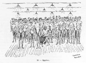 “Je moest je bagage afgeven en je heel snel uitkleden; je kleren werden stuk voor stuk uit je handen gerukt. Daarna moest je op een tafel gaan liggen, één vrouw hield je vast, terwijl een ander al je lichaamsopeningen met een vinger doorzocht. Dan moest je op een krukje zitten en werd je kaal geschoren.”